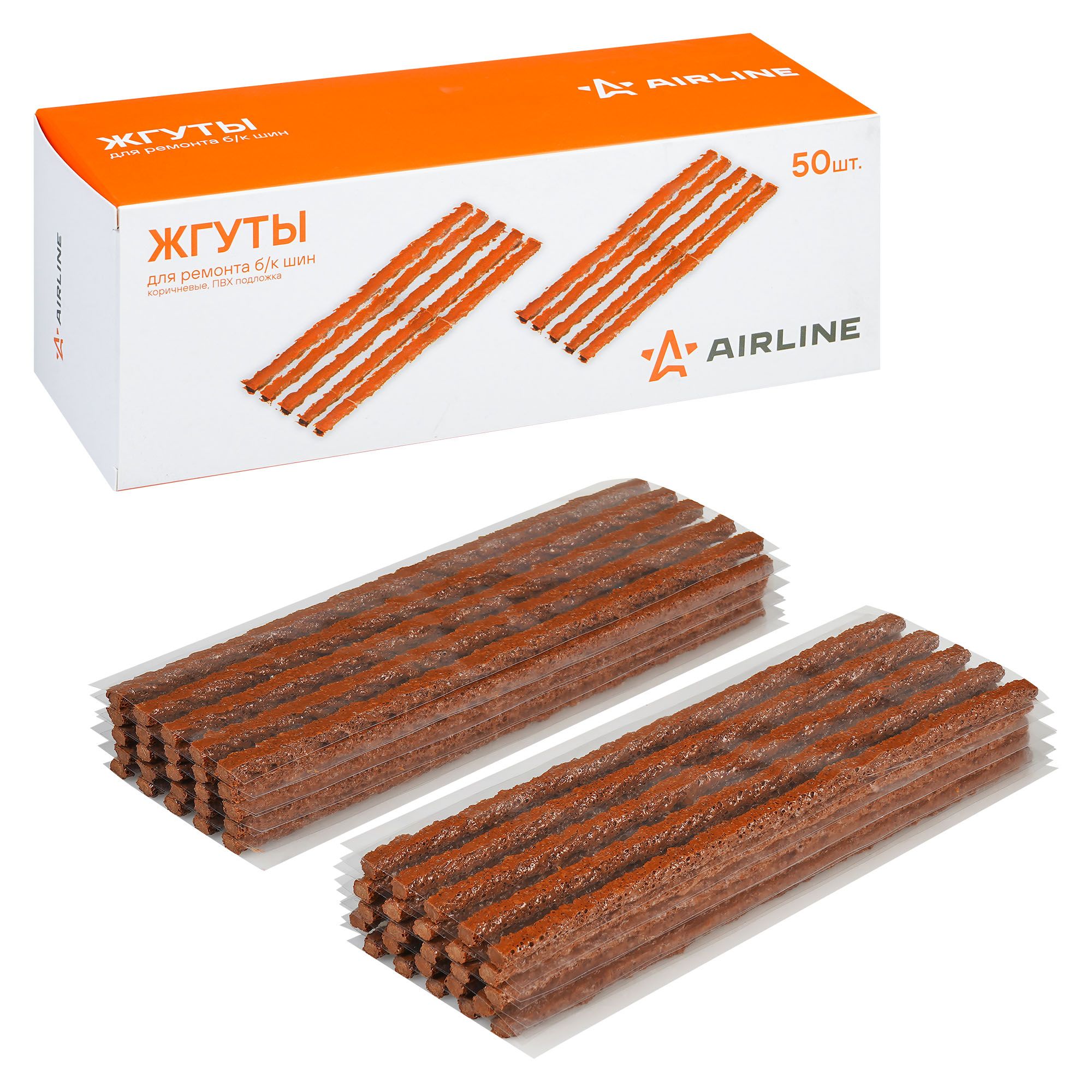 Жгуты для ремонта б/к шин, 4.5*100мм, 50 шт, коричневые, ПВХ подложка, в коробке Airline