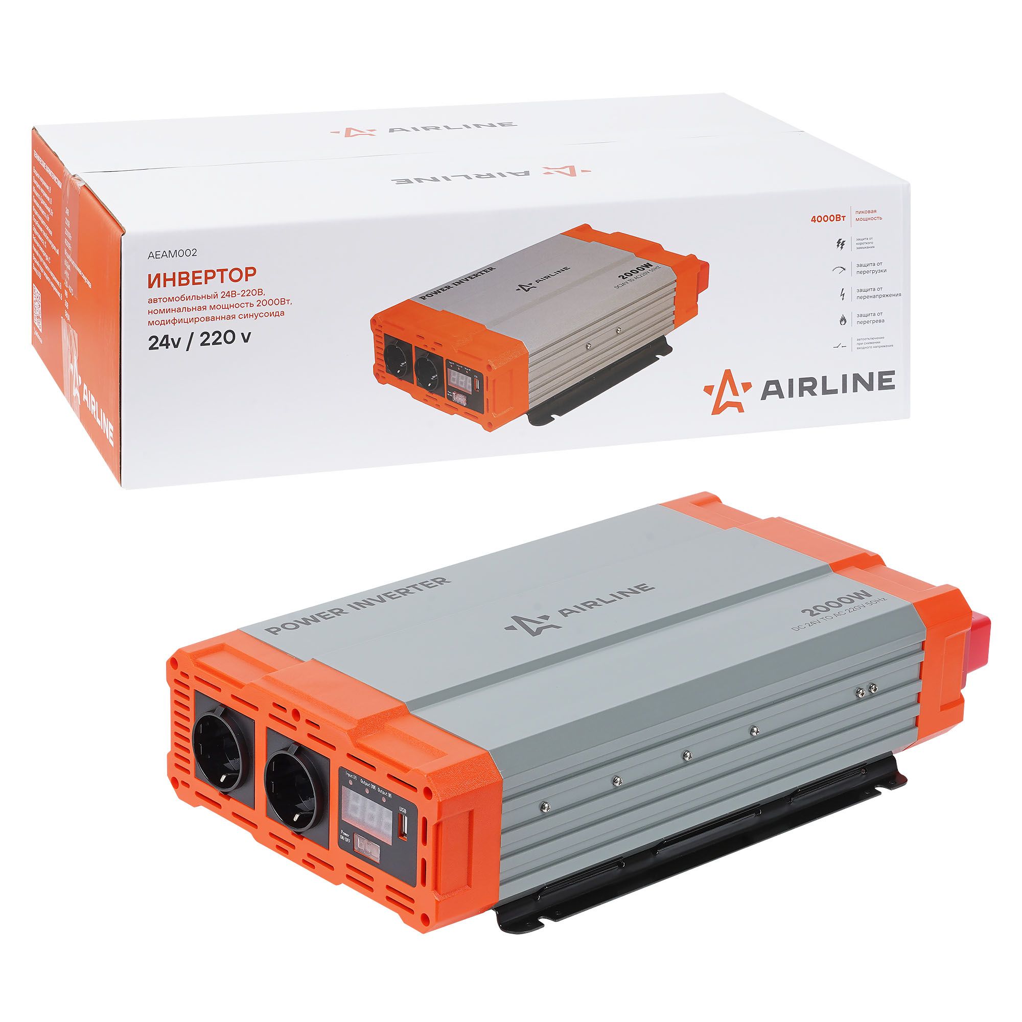 Инвертор автомобильный 24В-220В, 1000 Вт (), завод AIRLINE Россия