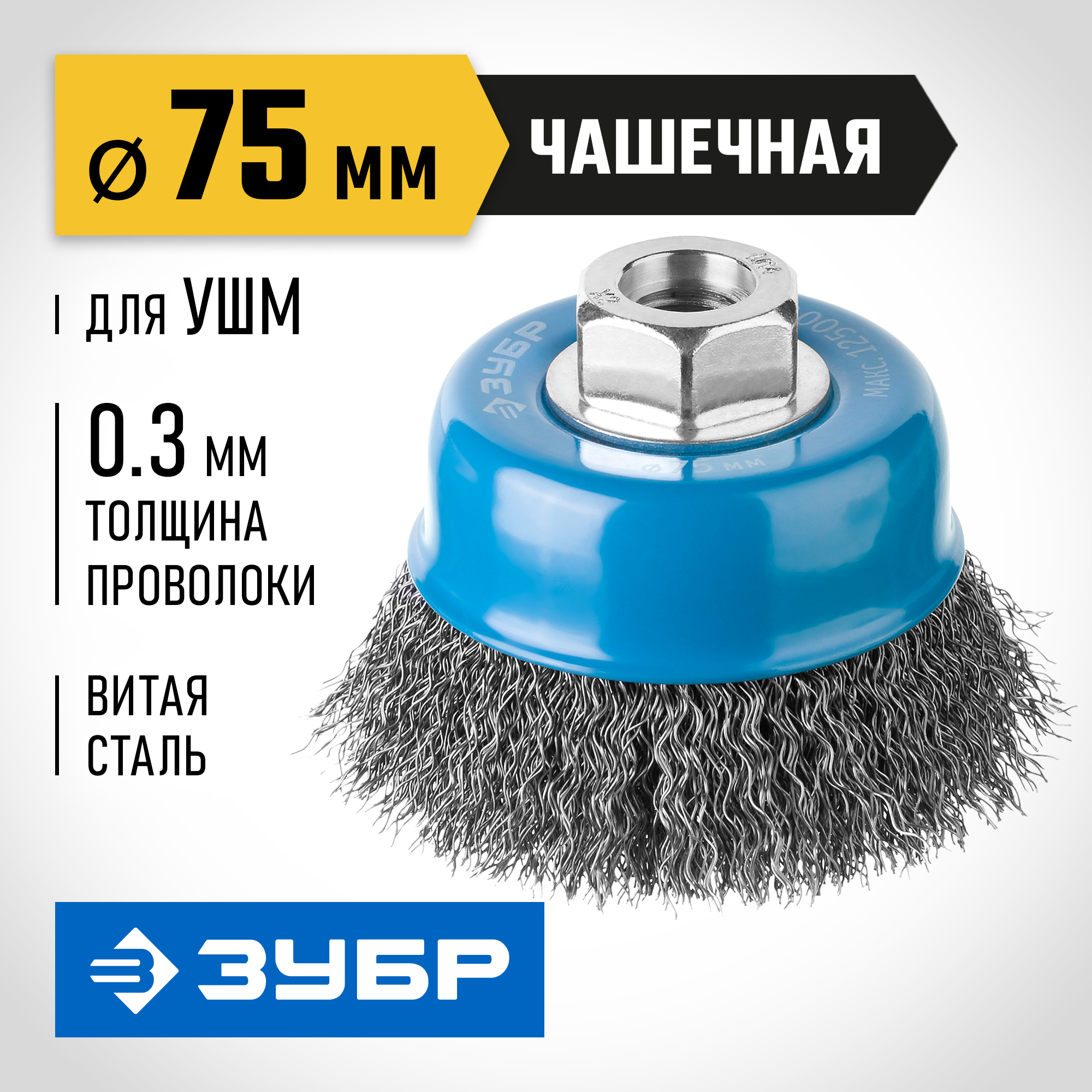 ЗУБР 75 мм, витая, стальная проволока 0.3 мм, чашечная щетка-крацовка для УШМ, Профессионал (35261-0 Зубр