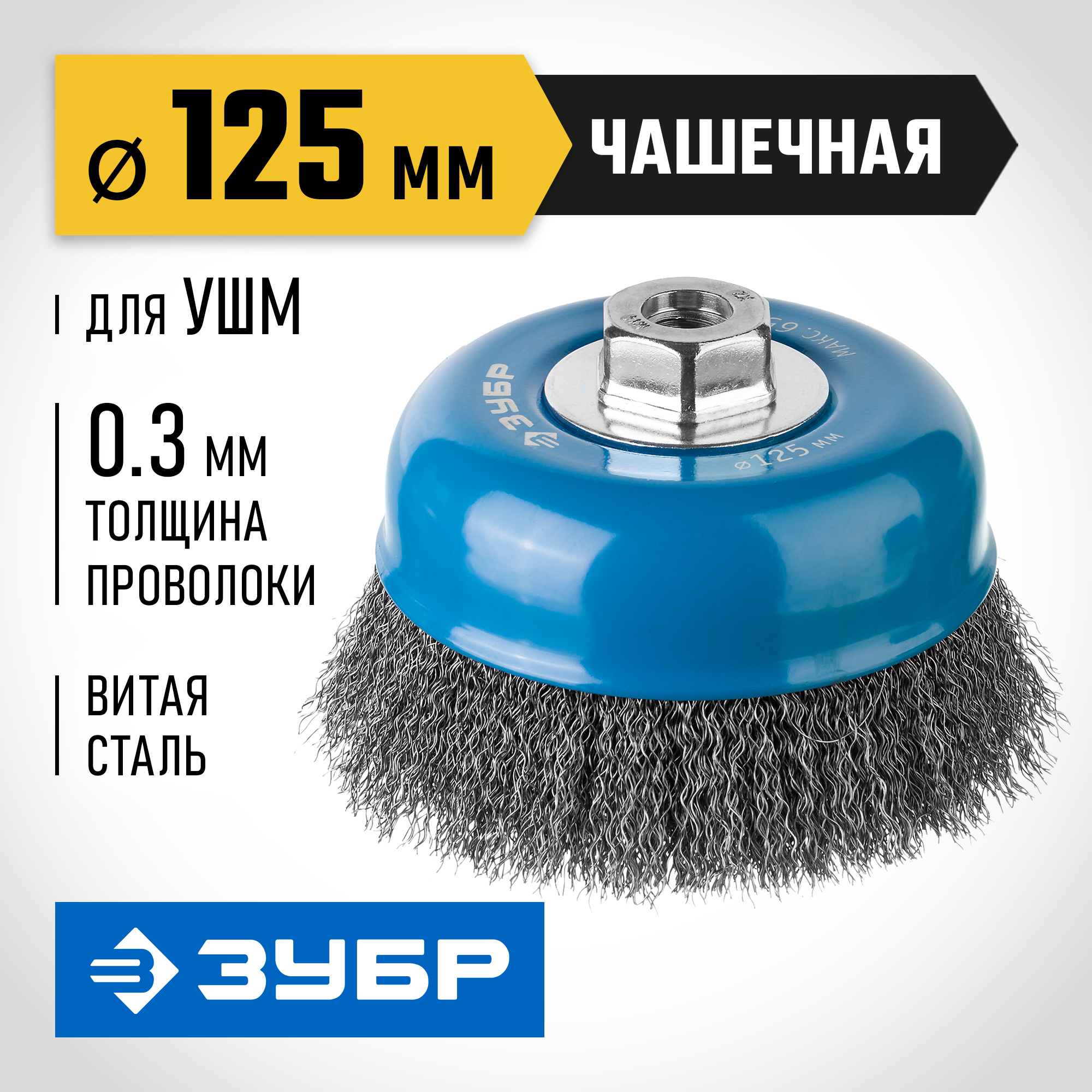 ЗУБР 125 мм, витая, стальная проволока 0.3 мм, чашечная щетка-крацовка для УШМ, Профессионал (35261-125) Зубр