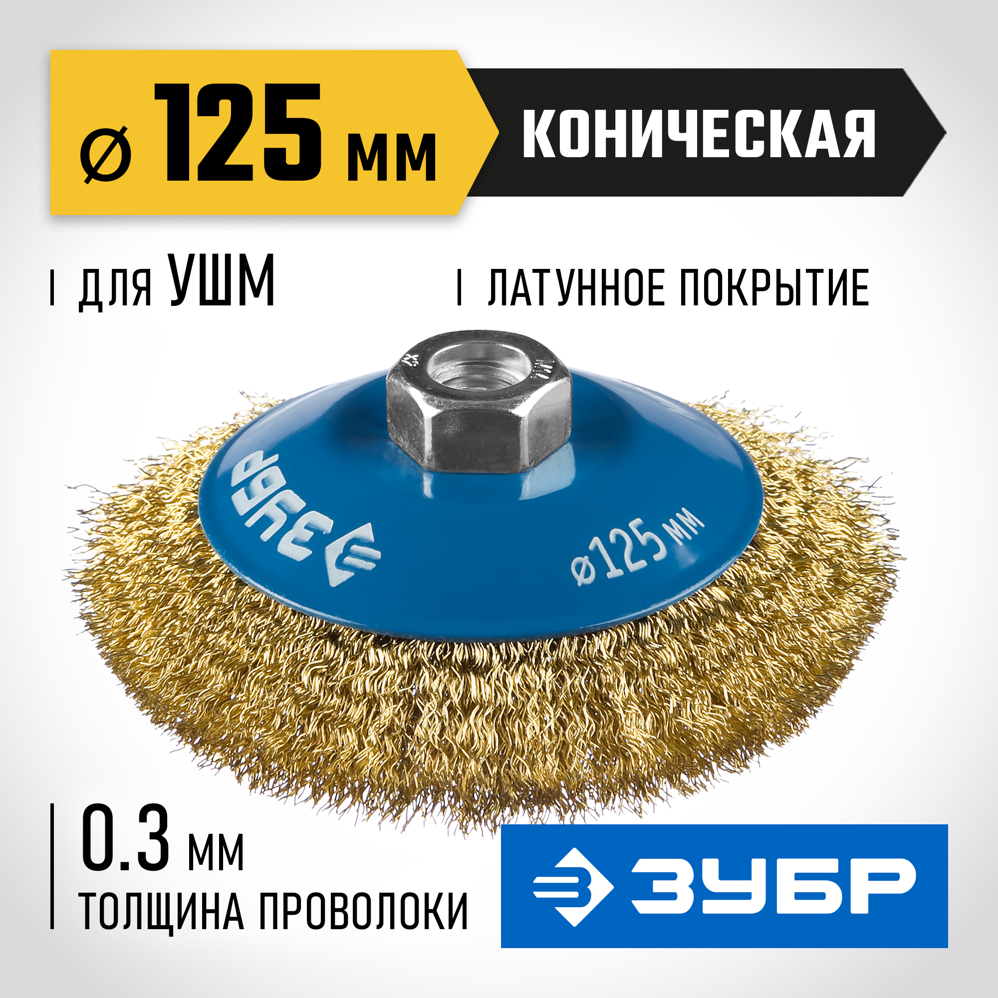 ЗУБР 125 мм, витая стальная латунированная проволока 0.3 мм, коническая щетка-крацовка для УШМ, Проф Зубр