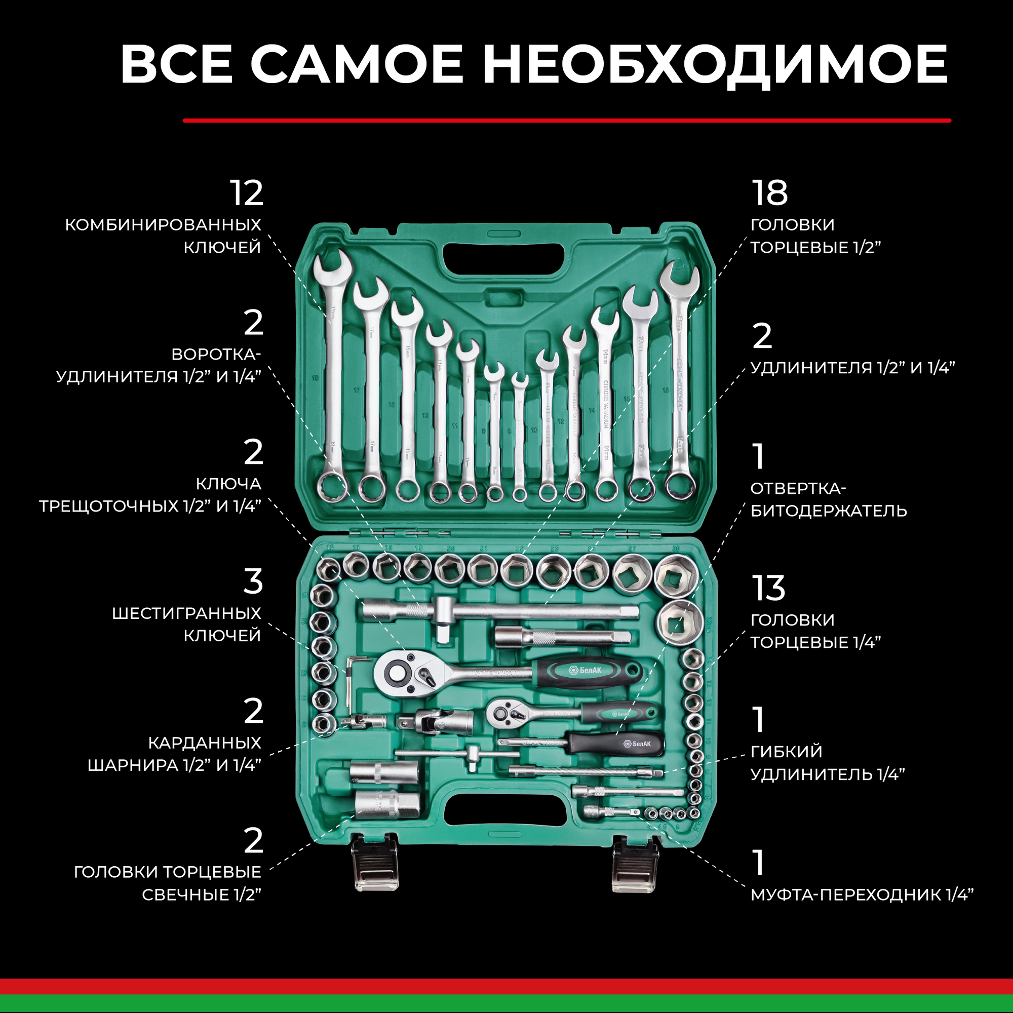 Набор инструментов 82 предмета 1/4" + 1/2" МАСТЕР 82 предмета БелАК