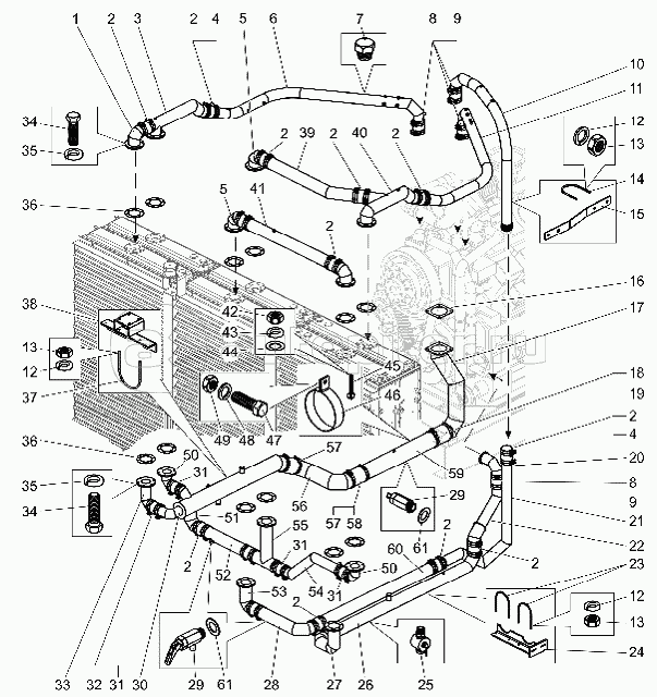 Установка трубопроводов системы охлаждения двигателя