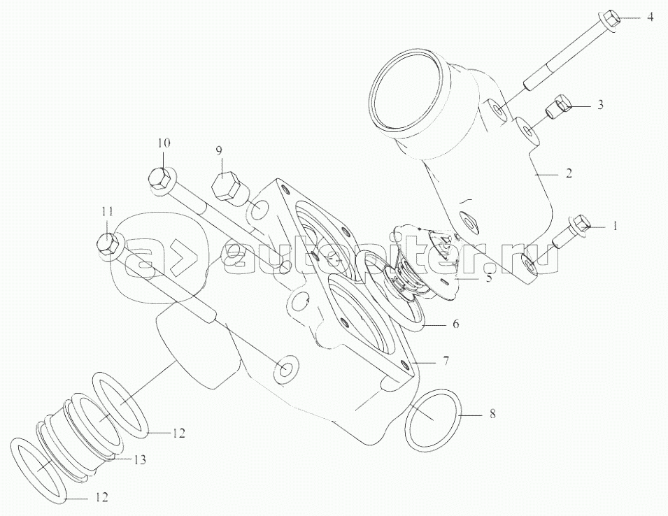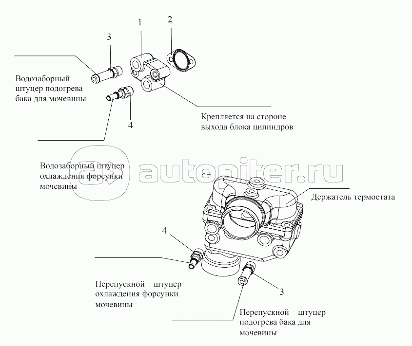 Термостат, крышка термостата, штуцера циркуляции по малому кругу
