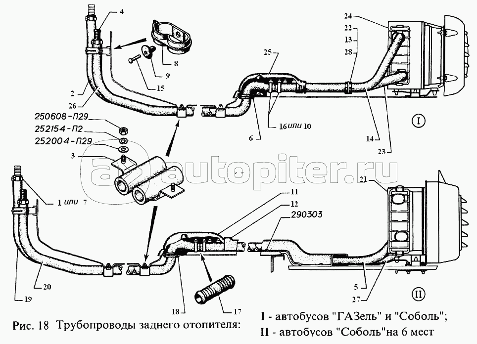 Трубопроводы заднего отопителя: I-автобусов "ГАЗель" и "Соболь", II-автобусов "Соболь" на 6 мест