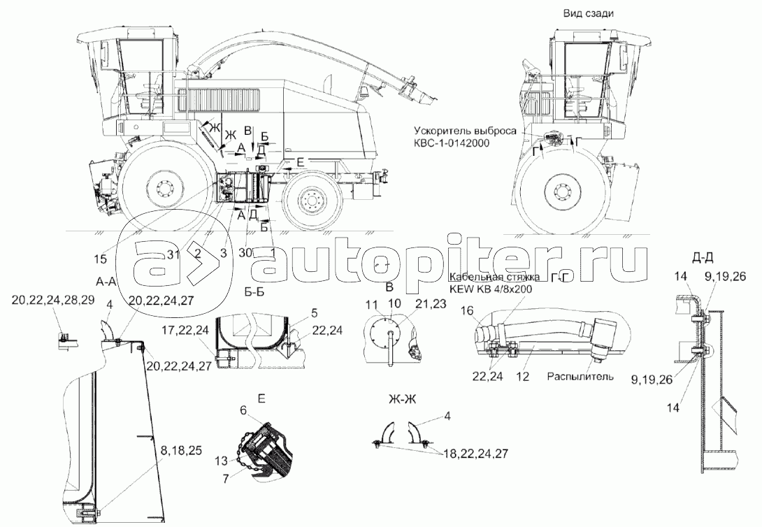 Измельчитель самоходный КВС-7Аппарат питающе-измельчающийАппарат измельчающийУстройство доизмельчающееУстановка двигателяГлавный приводВентиляция и отоплениеУстановка топливного оборудованияШассиМост управляемых колесУстройство тягово-сцепноеМеханизм вывешиванияКолесаПлощадка управленияРулевое управлениеКолонка приводаКабинаГидросистемаПневмосистемаУстановка электрооборудования