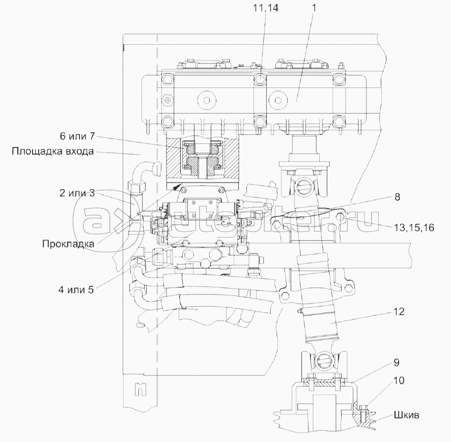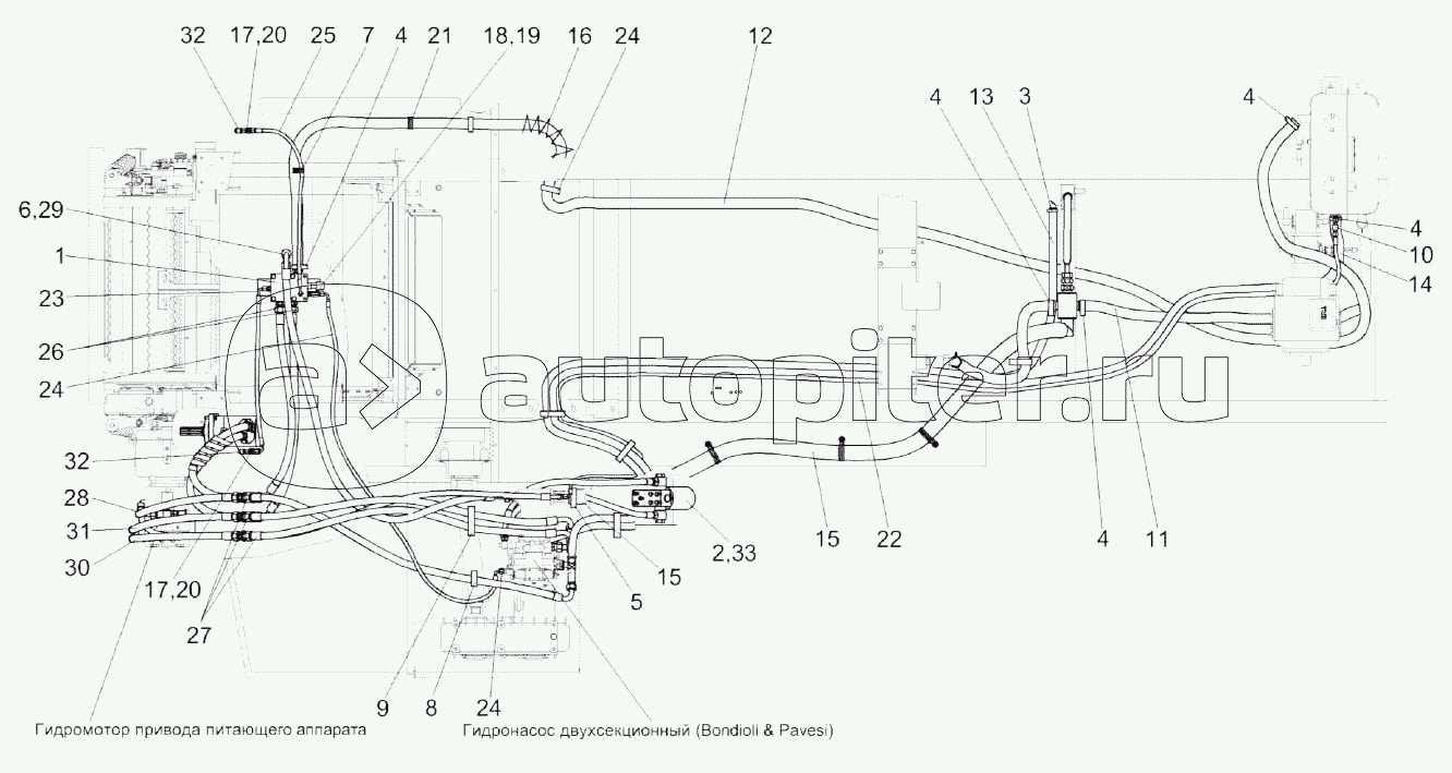 Гидросистема привода питающего аппарата и адаптеров комбайна КВК-800-16 КВС-2-0604000Б (вид сбоку)