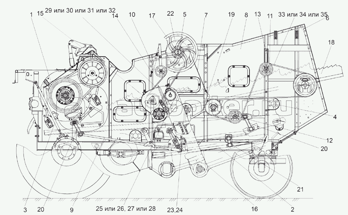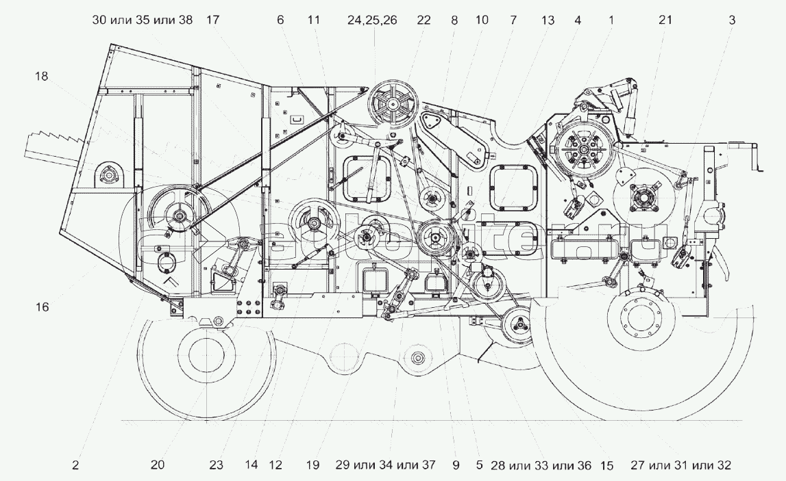 Молотилка самоходнаяШассиКоробка передачМост управляемых колесУстройство тяговоеКолесаБункерЭлеватор зерновойСоломоизмельчительДвигательВентиляторКапотыКабинаПлощадка управленияГидросистемаПневмосистема