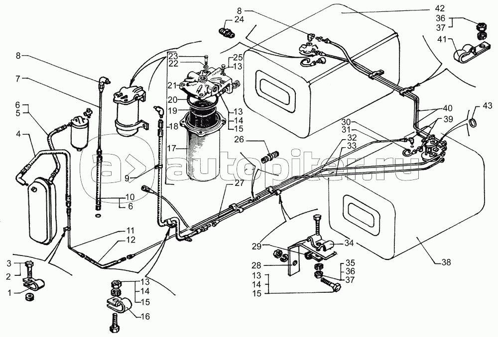 Топливные баки, топливопроводы и фильтр грубой очистки топлива автомобиля КрАЗ-64431-02
